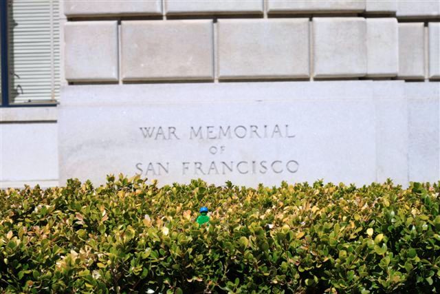 Before moving on to his next adventure in the field the Little Peacekeeper visits the San Francisco War Memorial Opera House (http://en.wikipedia.org/wiki/San_Francisco_War_Memorial_Opera_House) where the UN Charta has been drafted and signed. You can see him outside right outside the building.