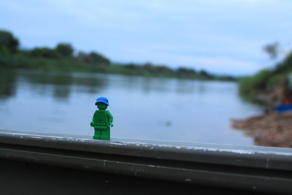 As you can see the Little Peacekeeper is on the road again. Well, he is on a water road to be precise. You can see him on the side of the boat looking out over the river. Do you have any ideas where he might be? As a hint, he has not been to this continent before…
