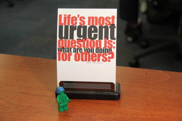 Life’s most urgent question Posted on January 17, 2011 by Rottmair Sebastian · Leave a comment At today’s Martin Luther King, Jr. Day the Little Peacekeeper finds a card that reads “Life’s most urgent question is: What are you doing for others?”. What do you think? Is this question one of life’s most urgent questions?